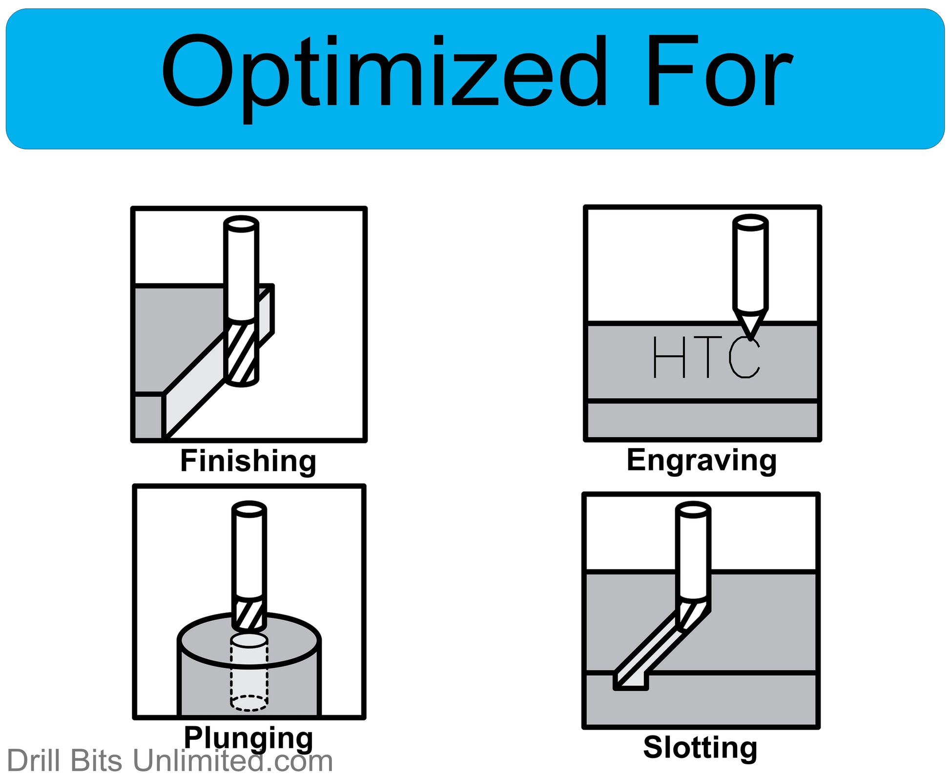 Our Two Flute Carbide End Mills are perfect for milling square slots, pockets, and final profiling in a variety of materials. Whether you're working with wood, non-ferrous metals such as aluminum, brass, and copper, PCB boards or even most composites, these end mills deliver exceptional results. With their large flute clearance, chip evacuation is increased, minimizing friction and heat buildup for a superior finish. Upgrade your milling game with our reliable and high-performing Two Flute Carbide End Mills.