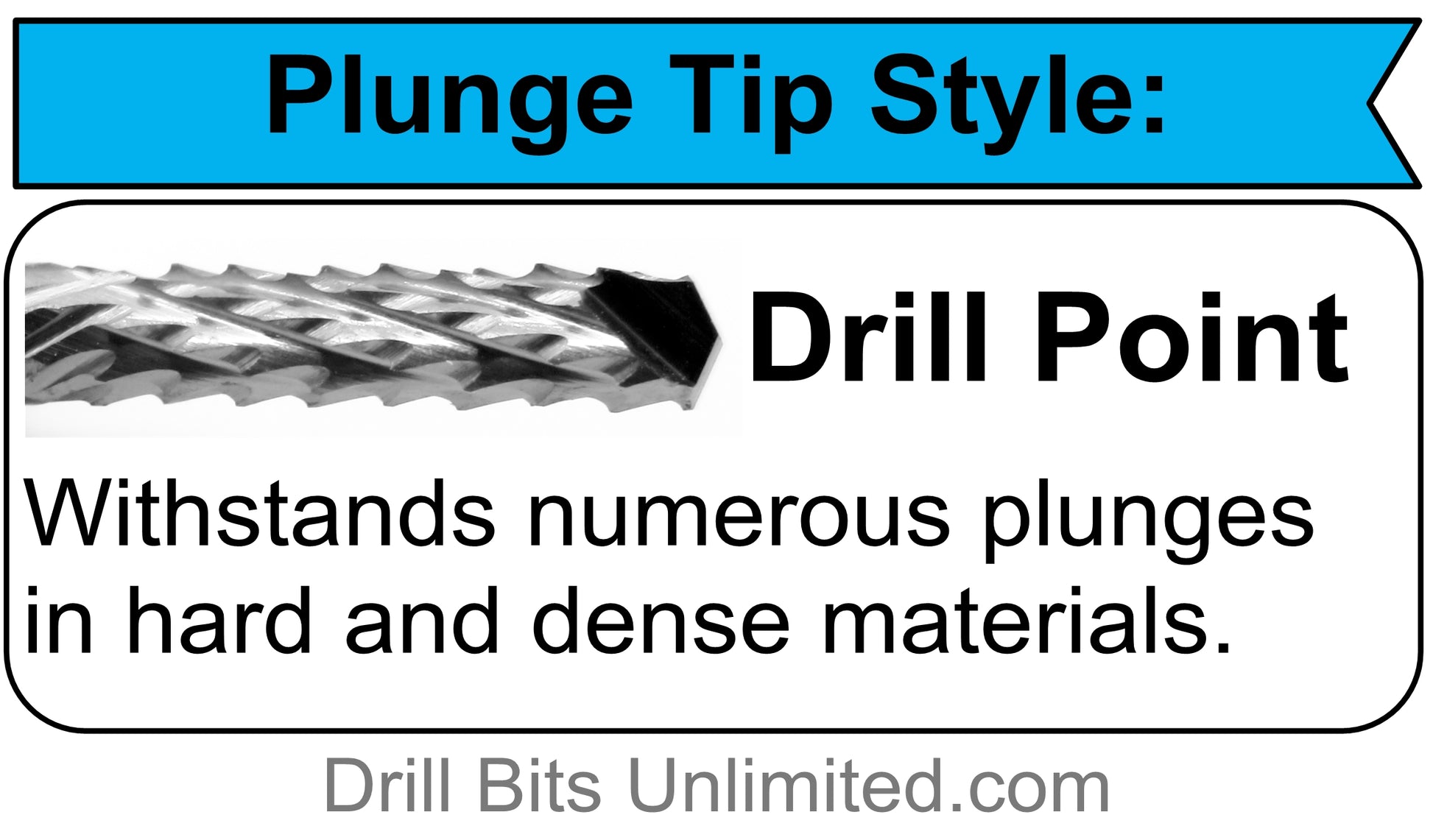 Drill point plunge tip holds up to high plunge rates and dense materials.