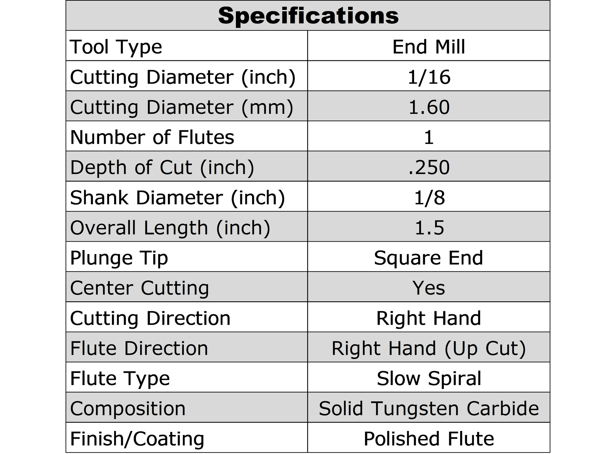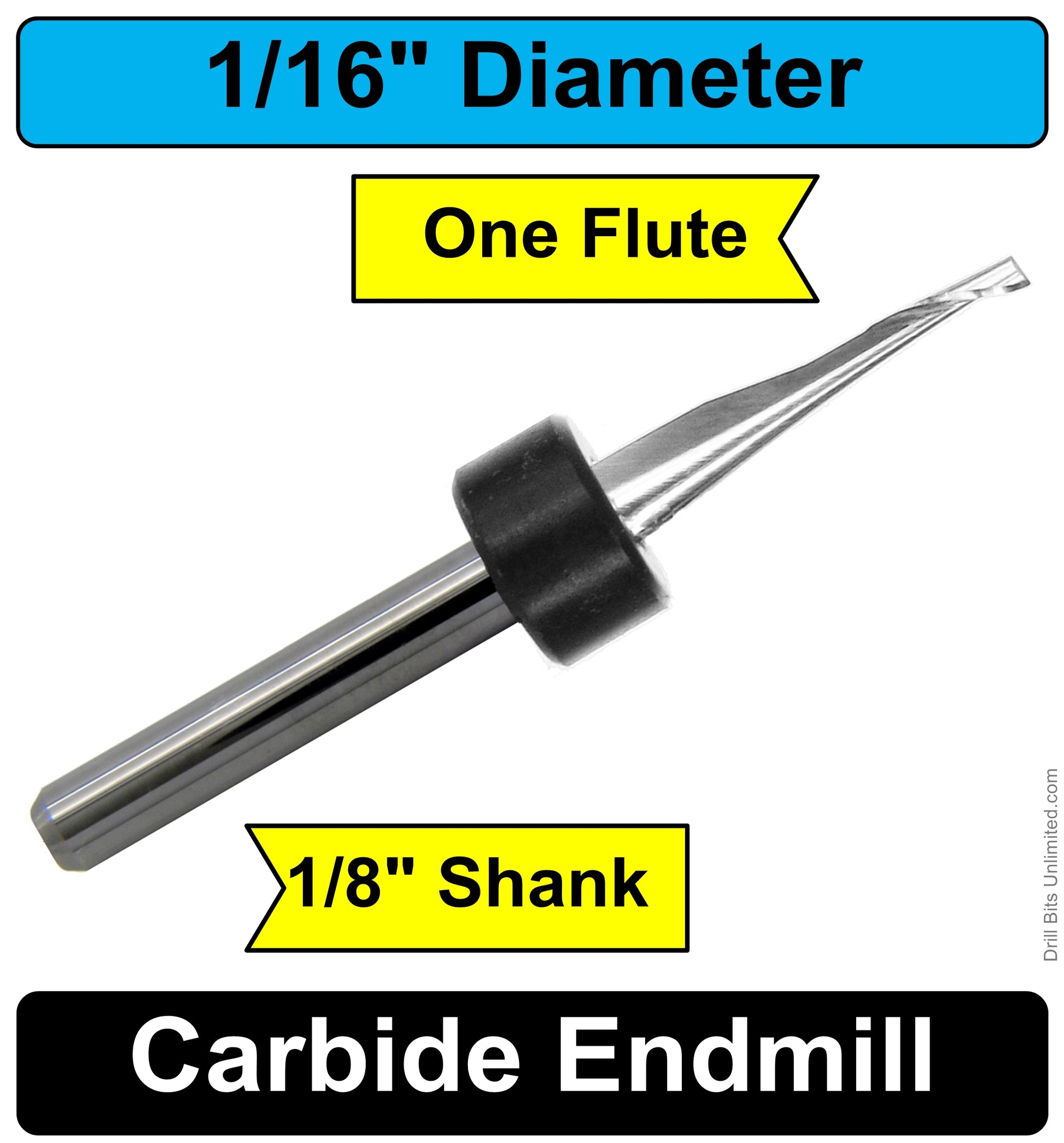 1/16" One Flute Carbide End Mill Bits for Copper, Aluminum, Brass, Plastics, soft materials URO105