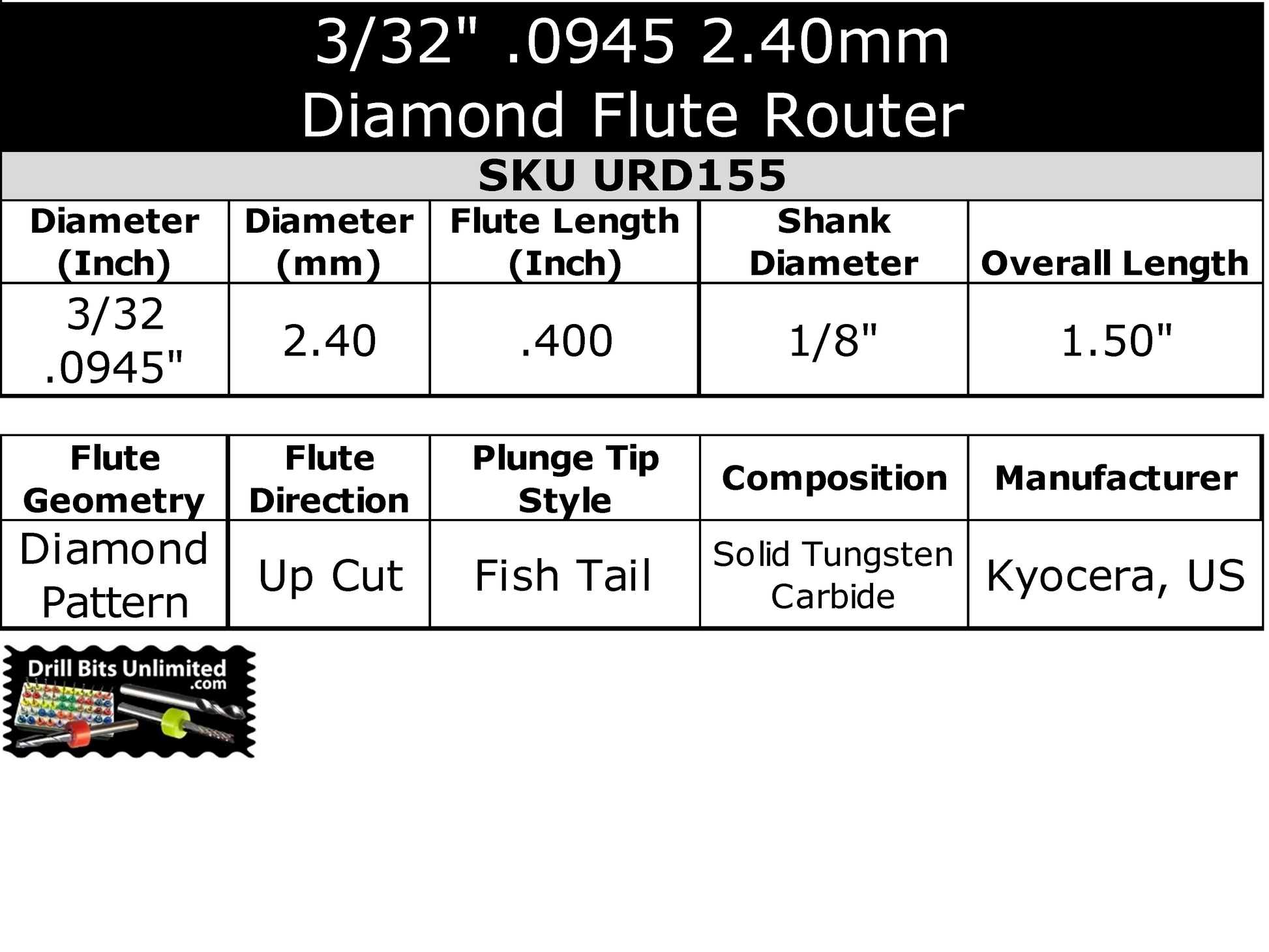 Diamond Pattern Flutes - Gently cuts materials without fracturing, burrs, or delamination.