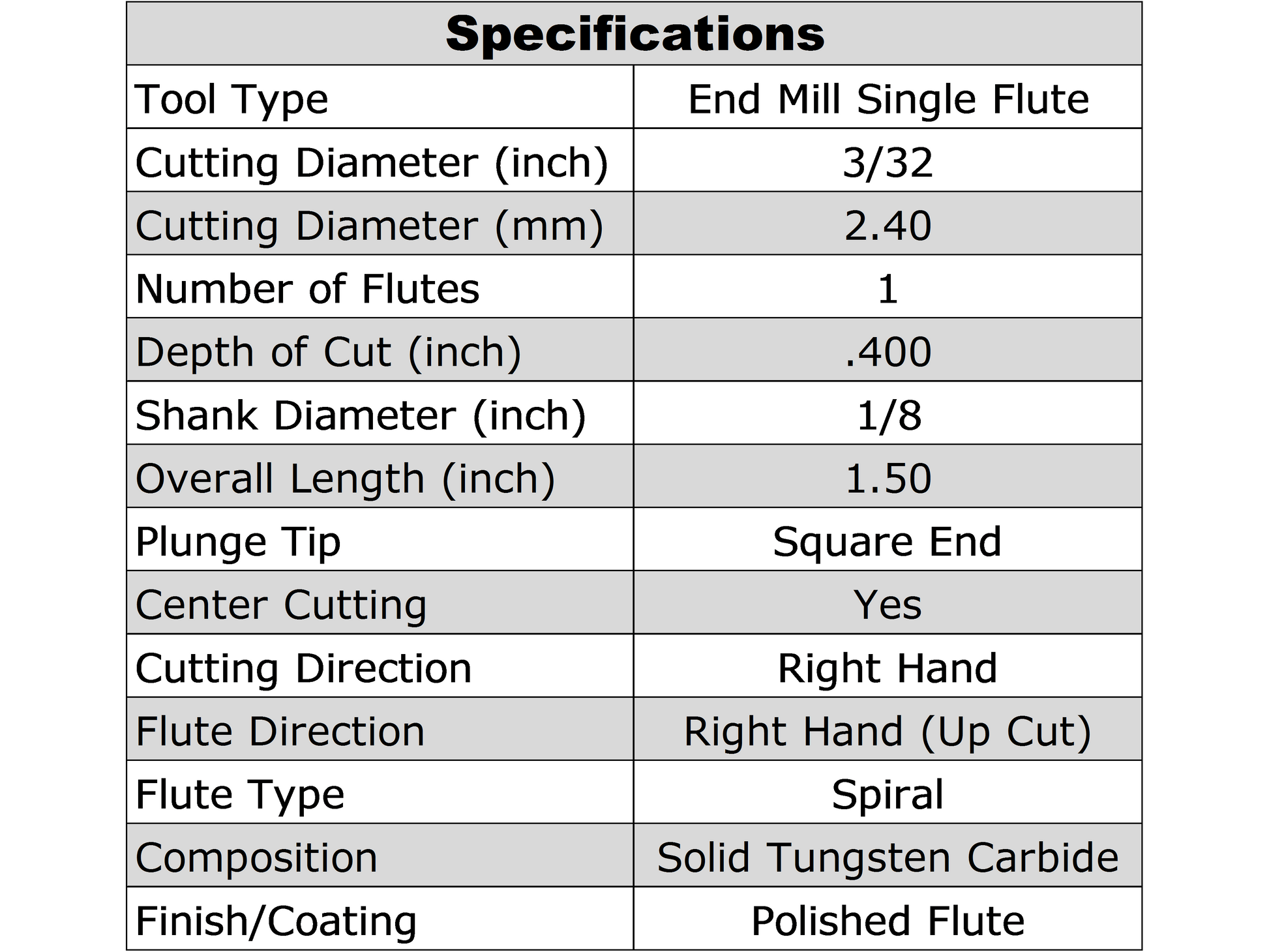 3/32" Single Flute Carbide End Mill for Aluminum, Plastics, Acrylic, Soft Metals LUM-B