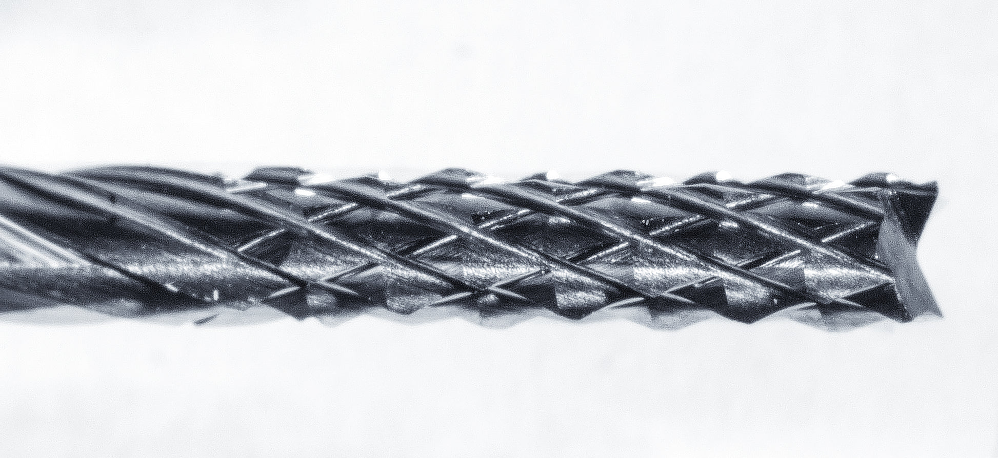 Diamond Pattern Flutes - Gently cuts materials without fracturing, burrs, or delamination.