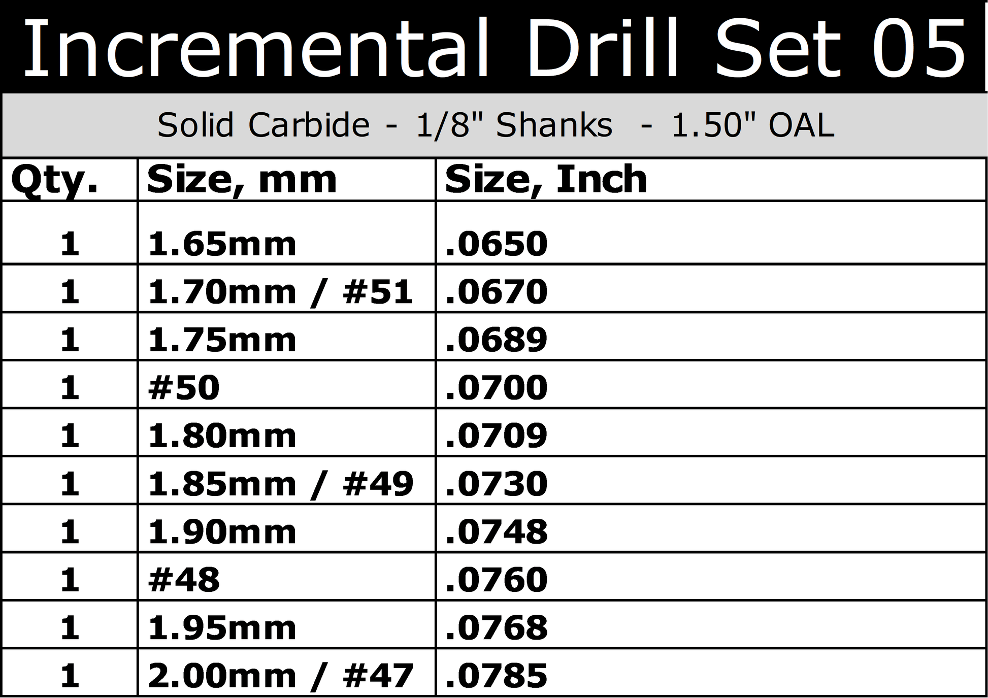 Carbide Drill Bit Set – Incremental Sizes .065″–.0785″, 10-Piece, 1/8″ Shank