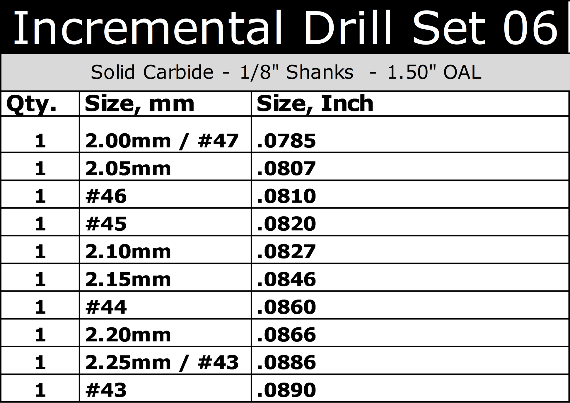 Incremental Size Solid Carbide Drill Set includes #47 2mm 2.05mm #46 #45 2.1mm 2.15mm .086 #44 2.2mm 2.25mm .089 #43